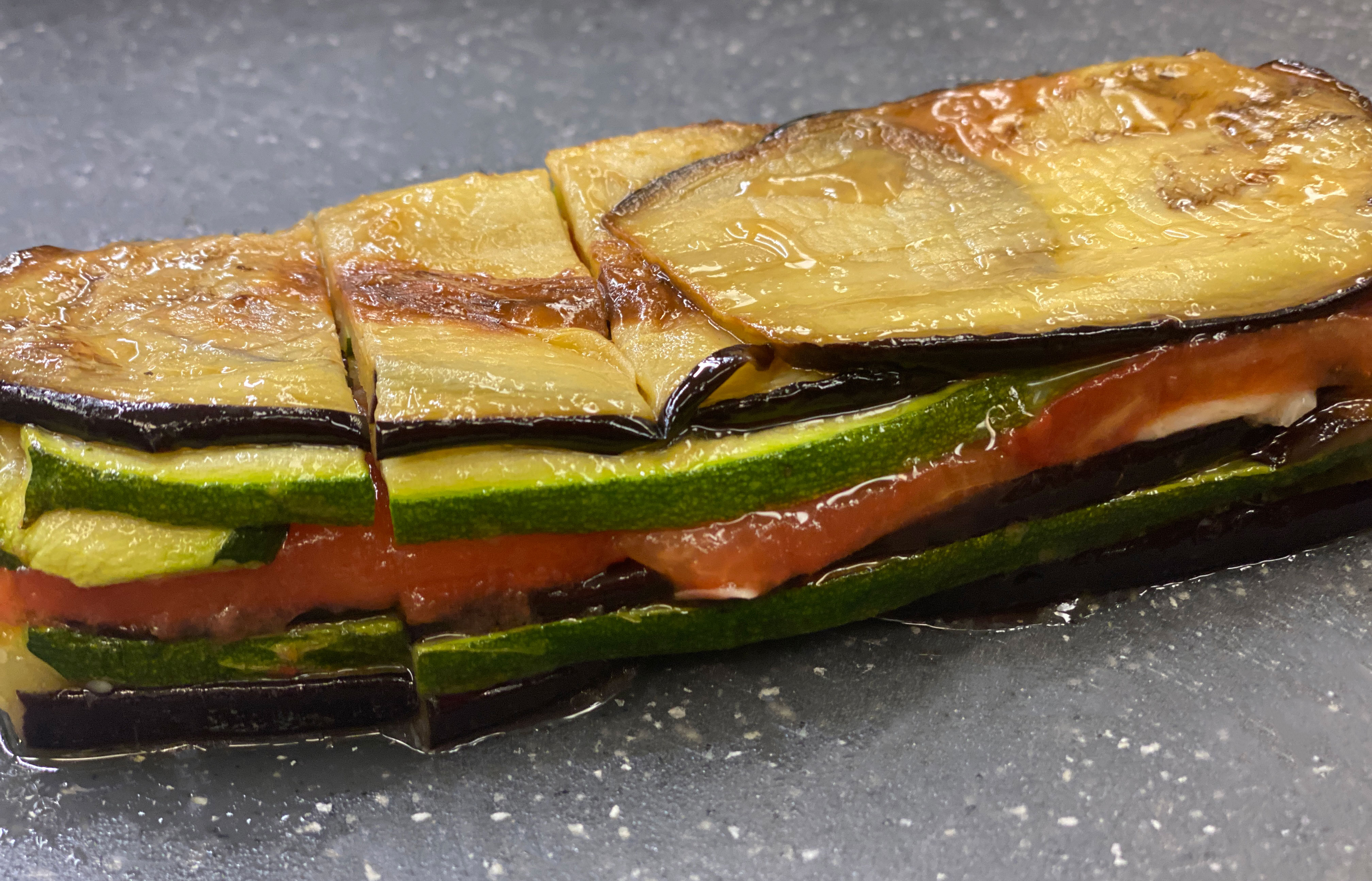 Precaliente el horno a 230 °C (450 °F). Cubra una bandeja para hornear con papel aluminio. Coloque las berenjenas en un colador sobre un tazón grande. Espolvoree al gusto con sal y deje reposar durante 30 minutos para que escurran. Después de este tiempo, enjuague las berenjenas para quitarles la sal y séquelas con papel absorbente. Incorpore la primera base de berenjena en la bandeja, luego ponga el calabacín, el tomate, luego otra capa de berenjena, otra capa de calabacín y por último otra tira de berenjena. Rocíe con aceite de oliva y sazone con sal y pimienta al gusto. Agregue más aceite de oliva si es necesario para que las berenjenas queden bien cubiertas. Incorpore en el horno precalentado hasta que las verduras estén tiernas.